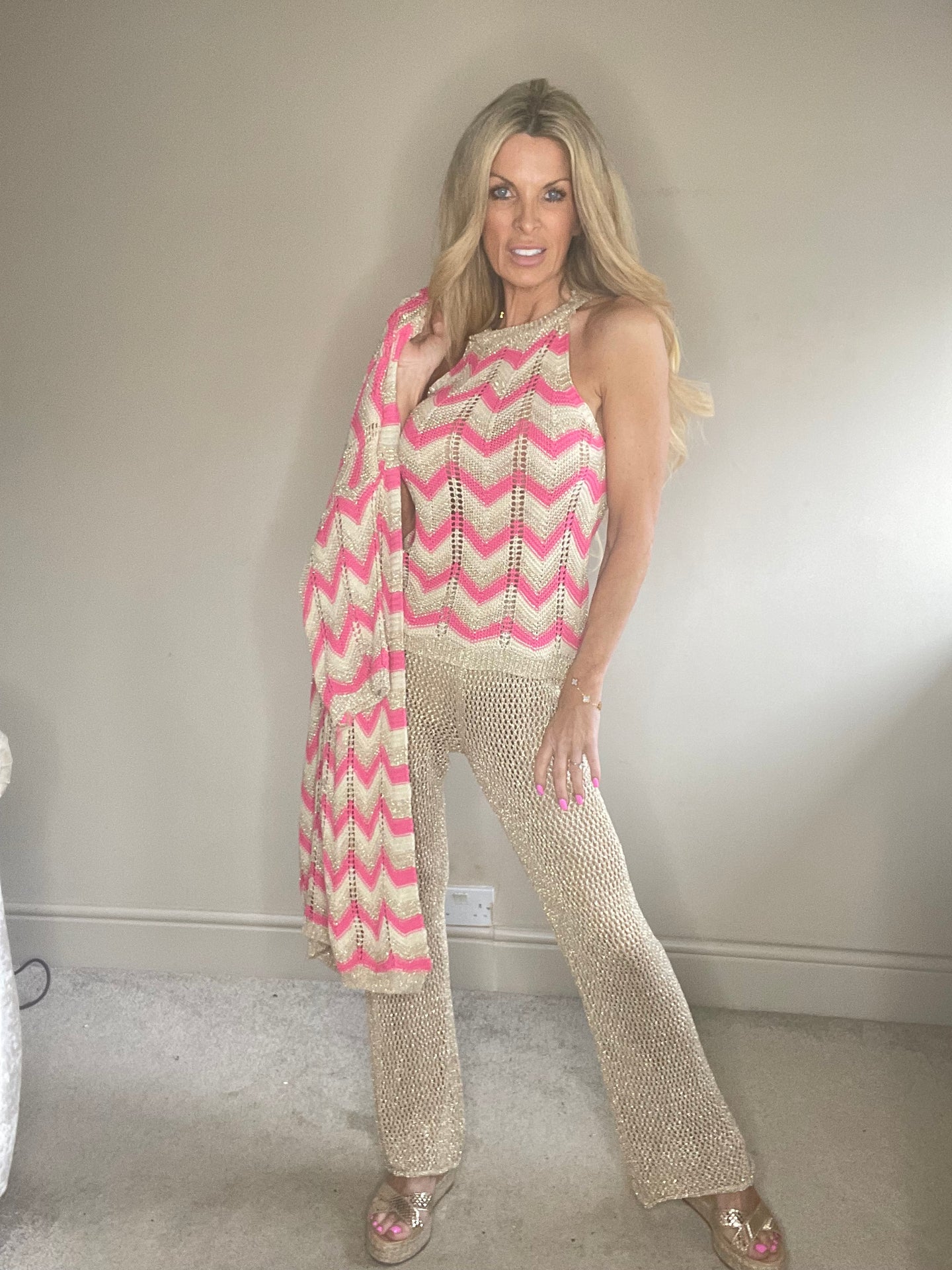 Gorgeous soft knit vest and kimono in a beautiful mix of pink, cream and gold…