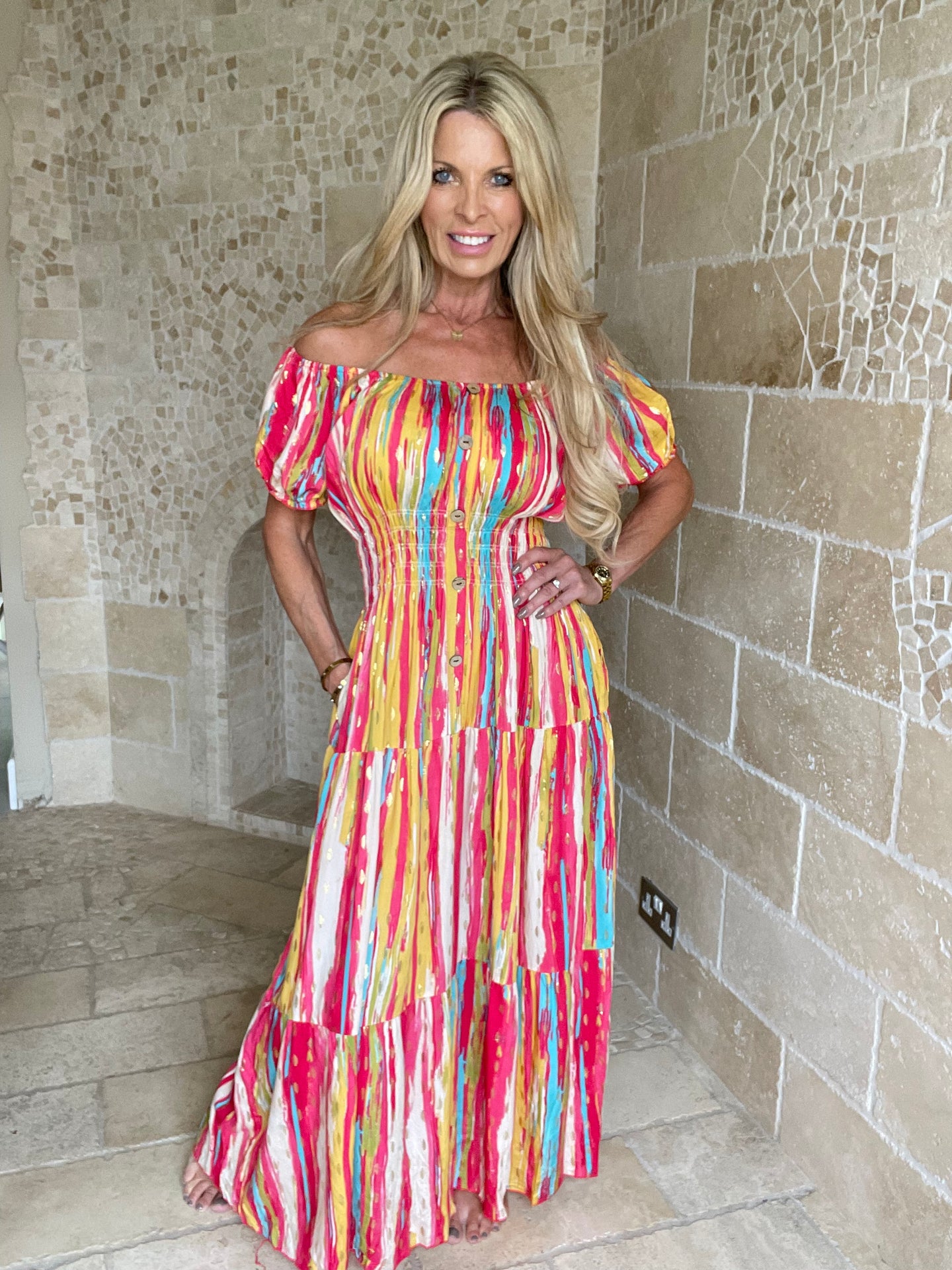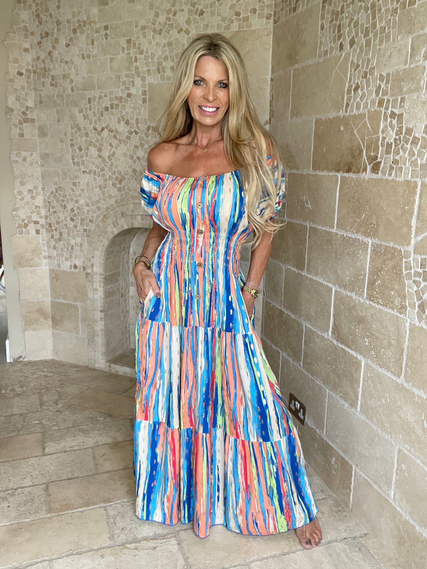 Beautiful colours and super soft fabric…. wear it on or off the shoulder…. (Dress is not lined) One size fits 6-14