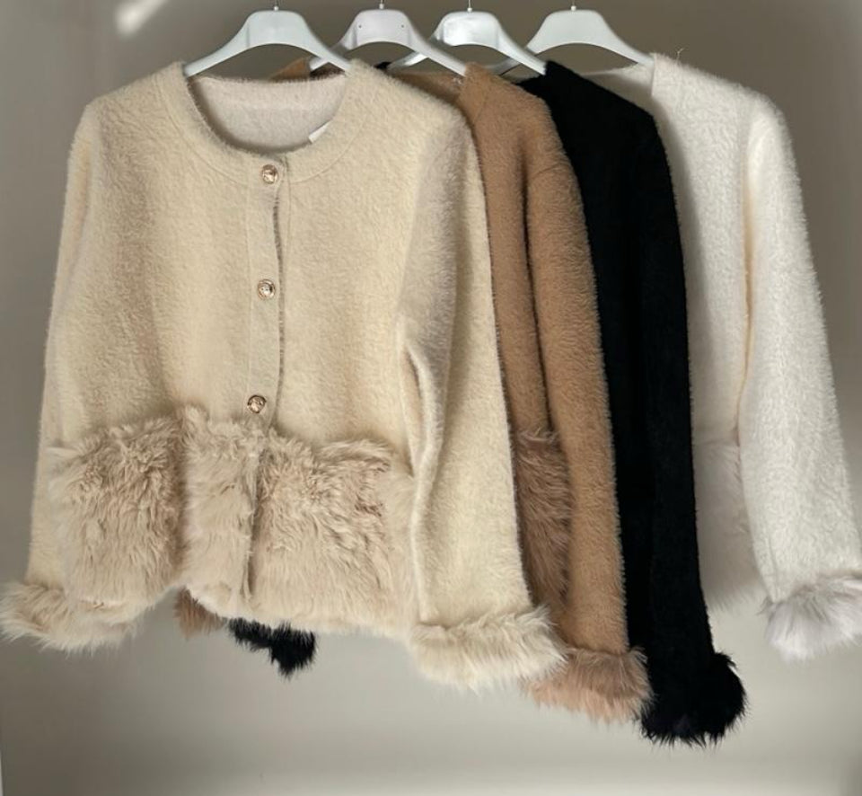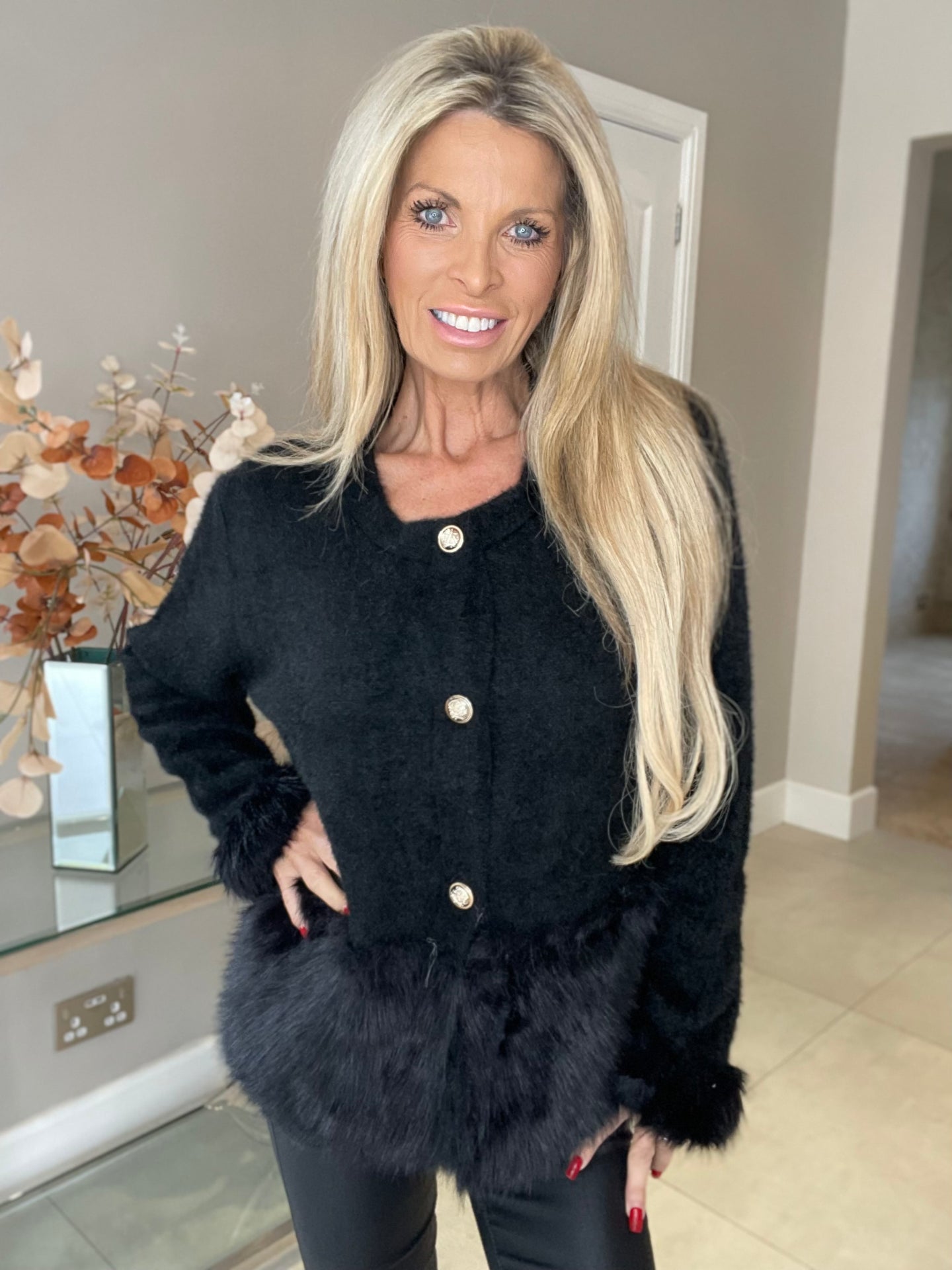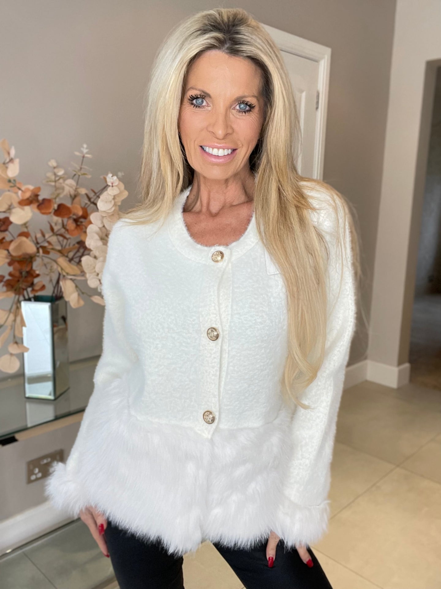 Super soft cardigan with faux fur cuffs and from detailing, gold button fastening , one size fits 6-14