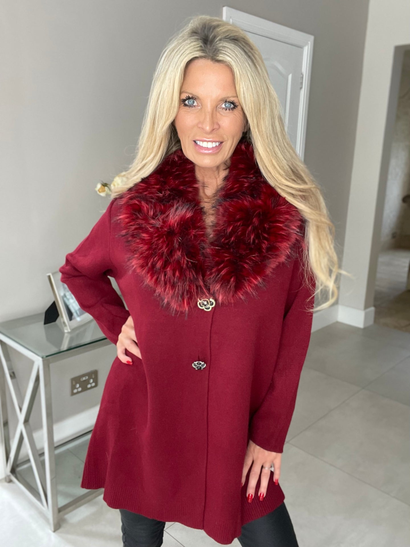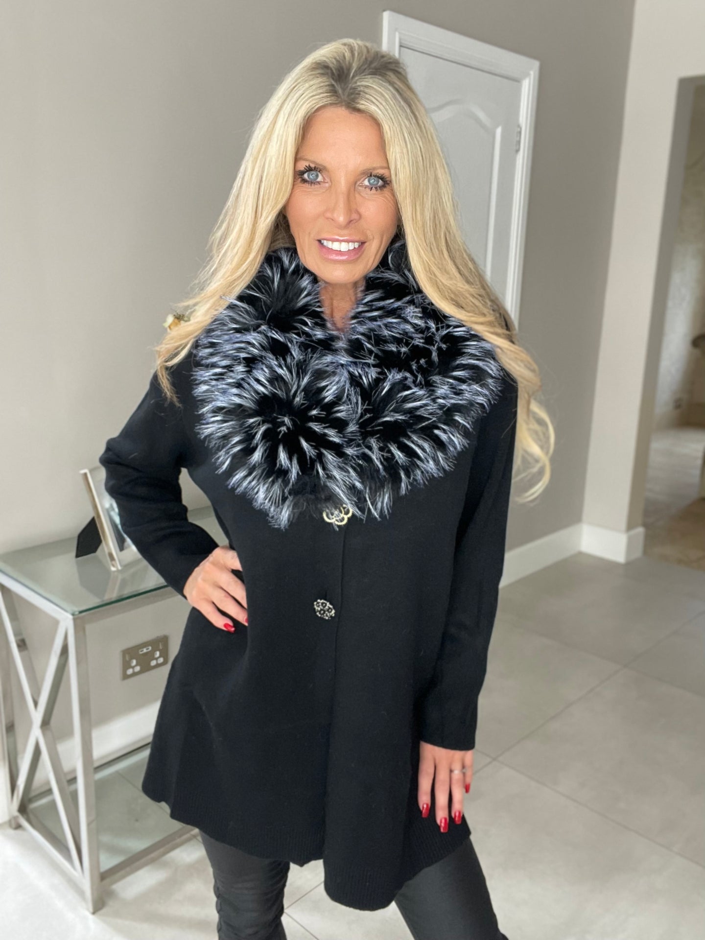 Gorgeous faux fur jacket…. Stunning thick sumptuous collar (removable) Lightweight knitted jacket with one flower style popper and one gem style button fastening… One size fits 8-16