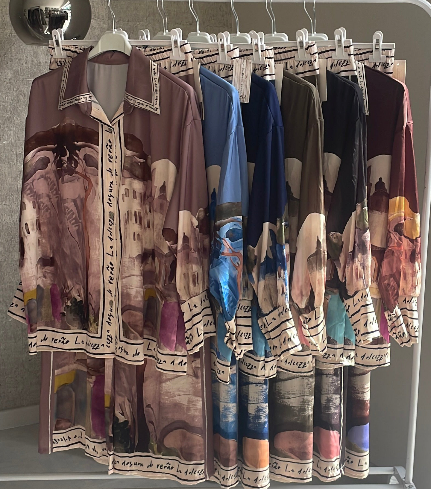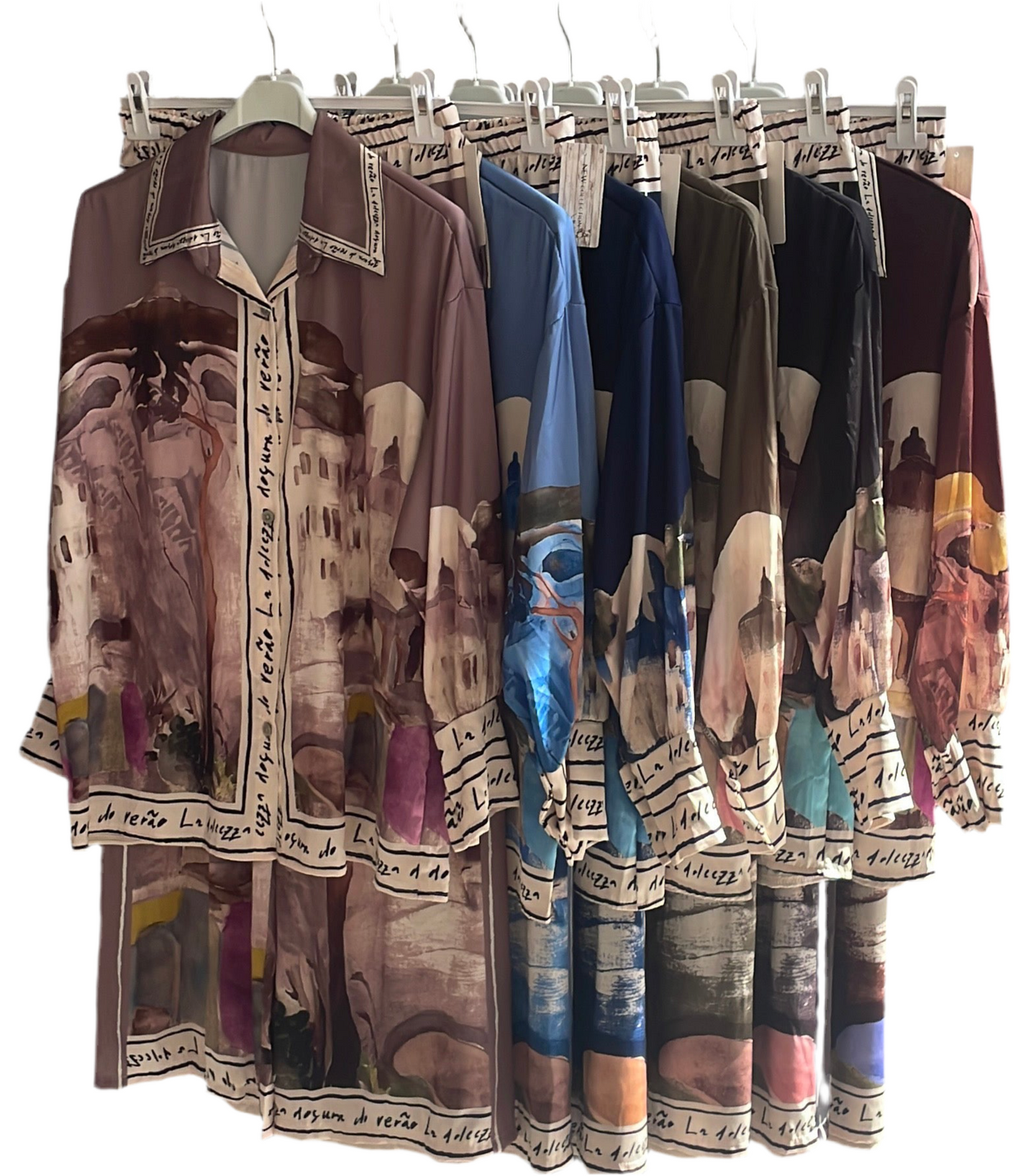 Trending Amalfi Coast Print…. Long sleeve top with button fastening…. Elastic waistband trousers… One size fits 6-14